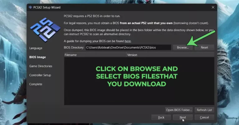 3. Set Up PCSX2: Open PCSX2, complete the Setup Wizard, choose your language, locate your BIOS folder, and continue with default settings.